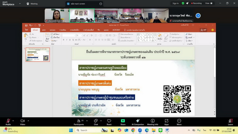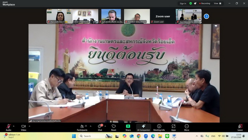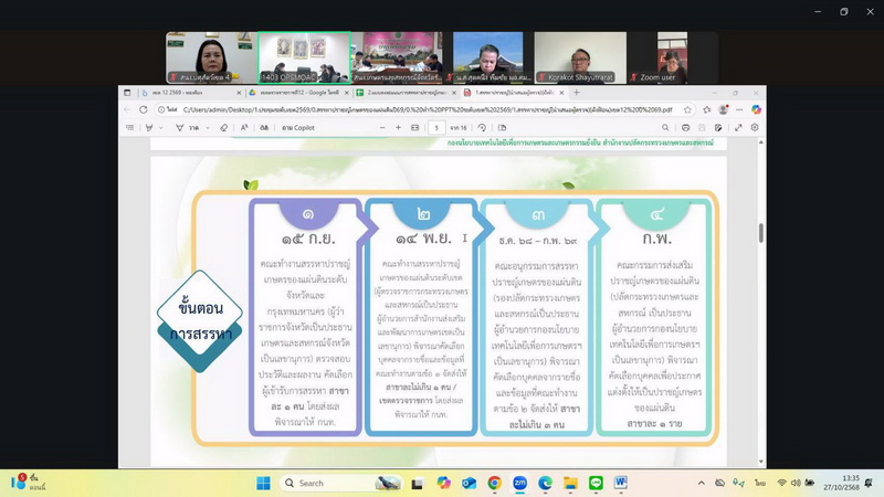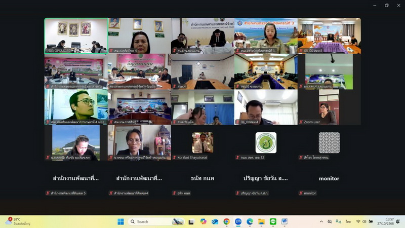 วันที่ 27 ตุลาคม 2568 เวลา 13.30 - 15.30 น. นางสาวเยาวนิตย์ บุรีรักษา ปศุสัตว์เขต 4 มอบหมายให้ส่วนยุทธศาสตร์และสารสนเทศการปศุสัตว์ เข้าร่วมประชุมคณะทำงานสรรหาปราชญ์เกษตรของแผ่นดินระดับเขต เขตตรวจราชการที่ 12 ประจำปี 2569 (กาฬสินธุ์ ขอนแก่น มหาสารคาม ร้อยเอ็ด) เพื่อพิจารณาคัดเลือกบุคคลที่สมควรได้รับการแต่งตั้งเพื่อเชิดชูเกียรติเป็นปราชญ์เกษตรของแผ่นดินระดับเขต 12 ผ่านระบบประชุมทางไกลออนไลน์ Zoom Meeting ณ ห้อง War Room สนง.ปศุสัตว์เขต 4 ต.ท่าพระ อ.เมือง จ.ขอนแก่น