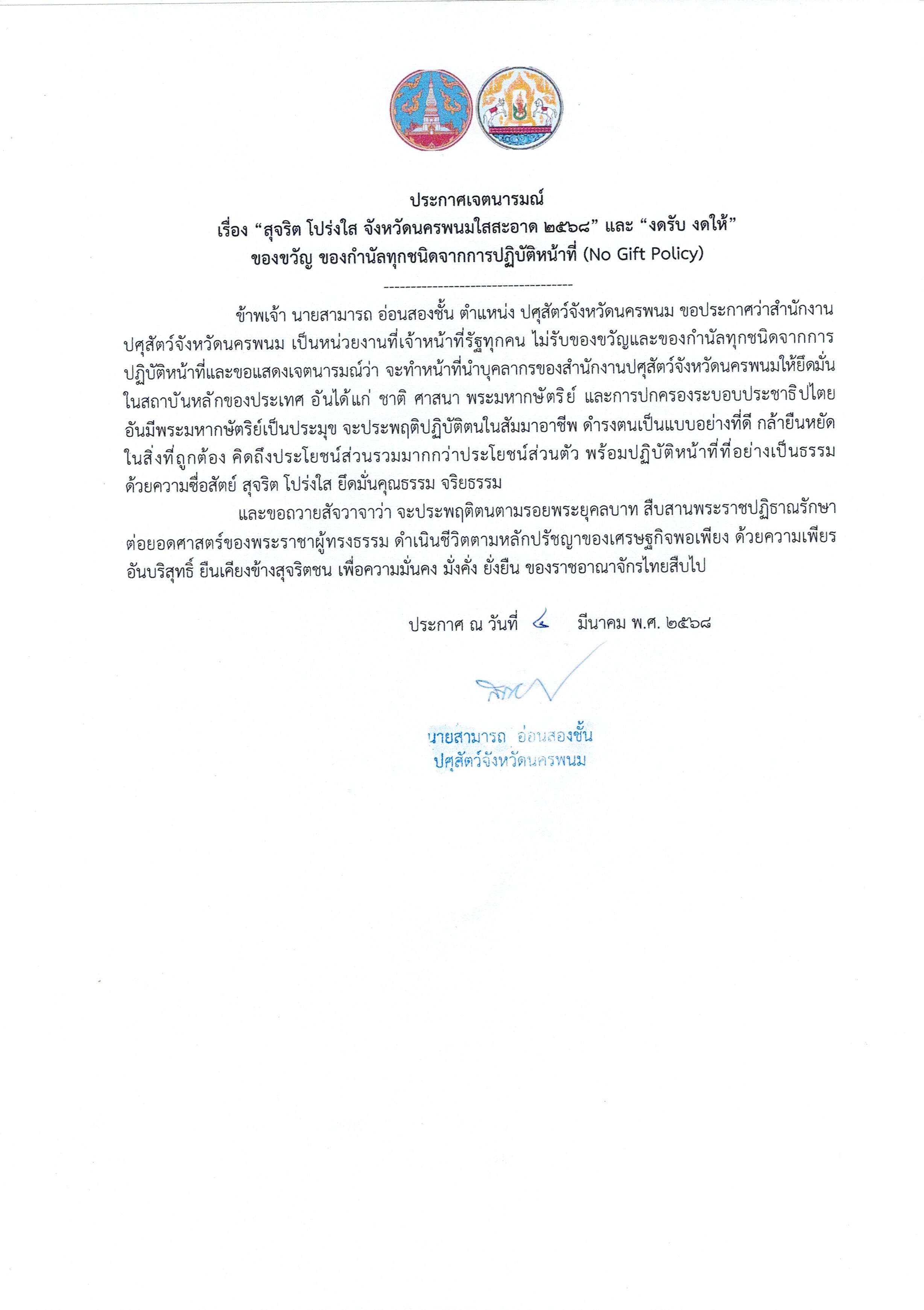 ประกาศเจตนารมณ์ เรื่อง "สุจริต โปร่งใส จังหวัดนครพนมใสสะอาด 2568" และ "งดรับ งดให้" ของขวัญ ของกำนัลทุกชนิดจากการปฏิบัติหน้าที่ (No Gift Policy)